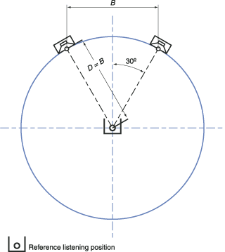 The recommended position for the left and right speakers, in a stereo configuration, is at a 60 degree angle relative to the listener, forming an equilateral triangle (a triangle with equal sides) as shown in the Reference Monitoring Position diagram (click to view). Fortunately, this setup eliminates most of the math and is easily simplified to the following guidelines: If you want to sit 1 meter (39.37 inches) from the speakers, place the speakers 1 meter apart. If you want to sit 6 ft from the speakers, place the speakers 6 ft apart. Etc.